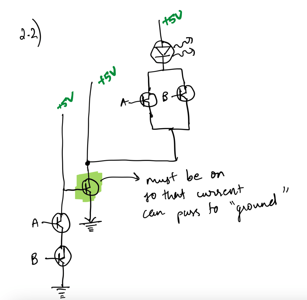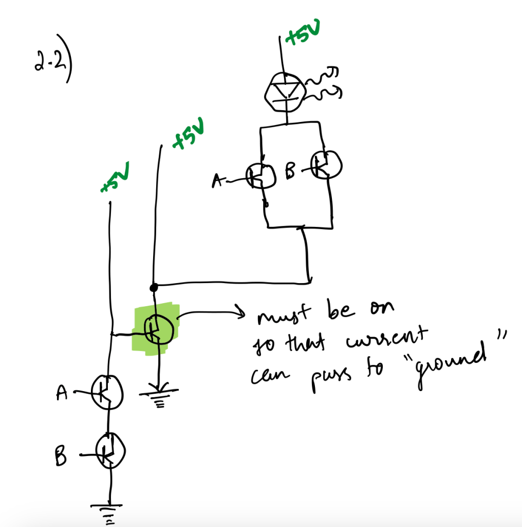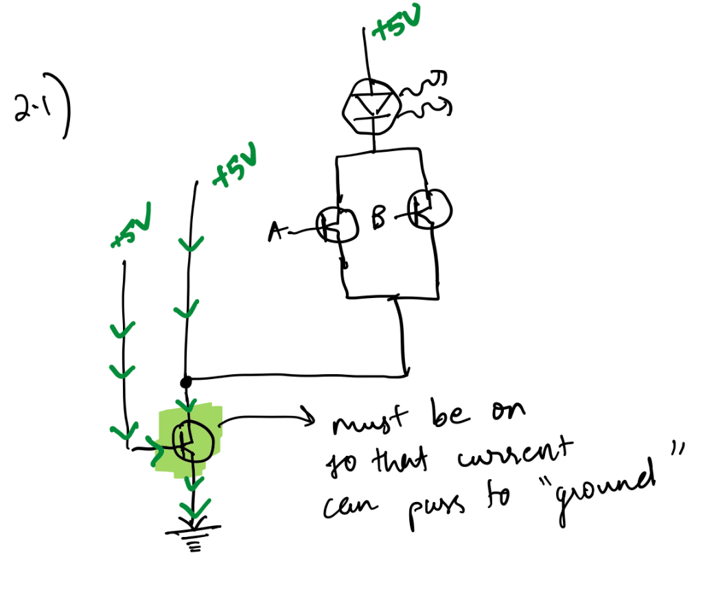 However, when both are 1, the left-most wire has both transistors turned ON, allowing that current to pass through, removing the input current into the green-highlighted transistor. This switches the green-highlighted transistor OFF, thus not allowing the output from the OR gate to pass, making the LED switch OFF.