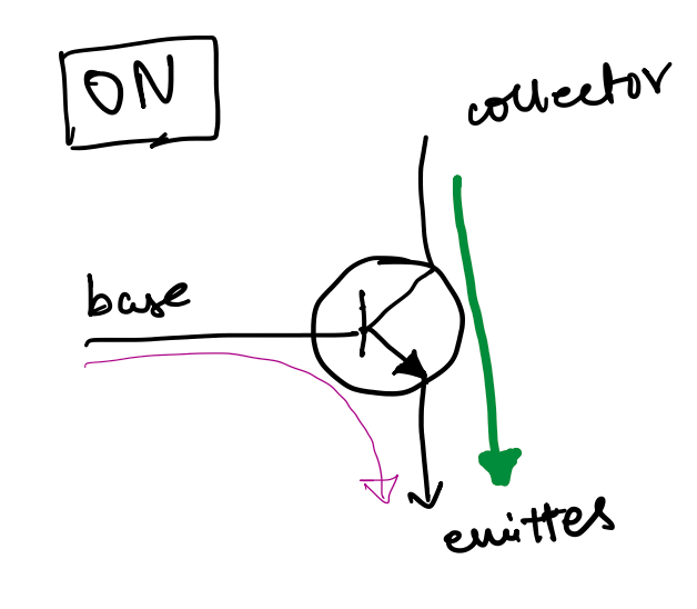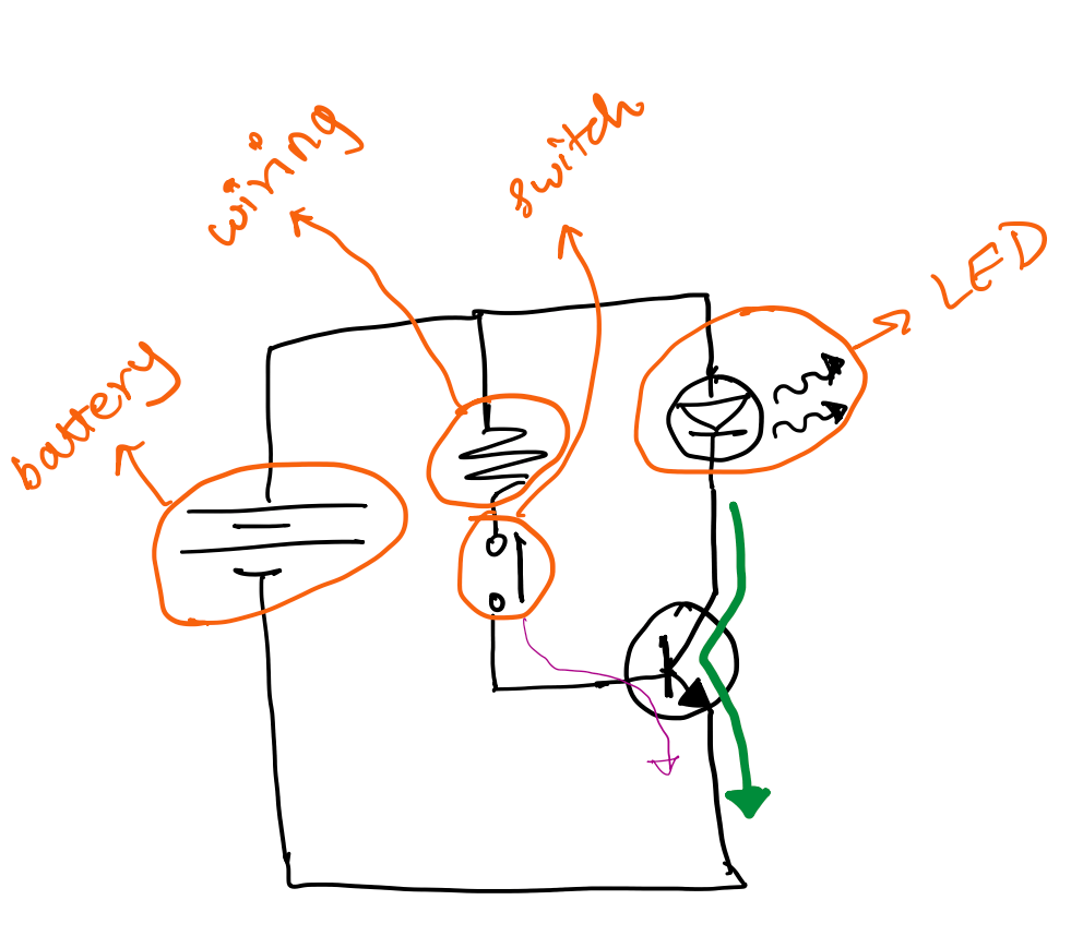 The above picture, drawn by yours truly, shows a transistor in a circuit with a battery, a switch, and an LED. All black lines indicate wiring, excluding the squiggly line, which indicates a resistor (while this is an important symbol, it does not play a crucial role in understanding our particular example). The purple thin arrow shows the current that needs to flow through the transistor to allow the big green arrow to flow. Contextualising the example, unless the current doesn’t flow through the base to the emitter (the purple arrow), the current indicated by the green arrow will not flow. Green dots are put at parts of the circuit called “junctions”; these are points where 2 or more wires connect, allowing current to split up.