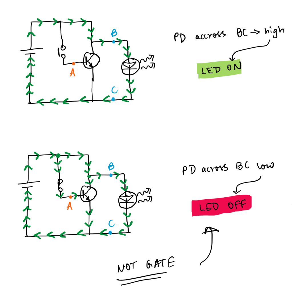 The first diagram above shows a current (indicated by the repeated green arrows) travelling across the circuit, through points B and C, and NOT through A. This happens because the button is not pressed, or as referred to more technically, the switch is open. When this is the case, the current doesn’t flow through point A, thus not going through the transistor. Therefore, the difference in potential across B and C is high, allowing the LED to light up.