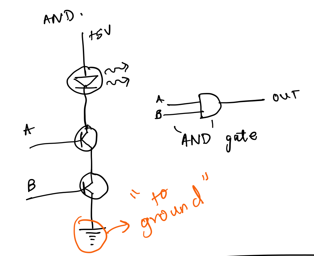 In this case, two transistors are connected in series, in which all circuit elements are arranged in a single path. Two inputs, A and B, allow us to control the state of the transistors and the LED. Feeding a current into the input A allows the larger current to pass through the first transistor.