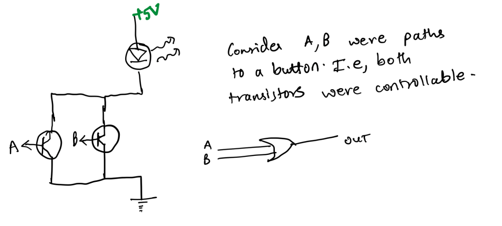 Let’s revisit circuit 1. That shows a classic OR logic gate. By the name, one can intuitively understand it means that whether A or B are 1, the output will be 1. However, when both are zero, the output will be zero too. If A or B were 1, that is, a current was flowing from the base to the emitter, it would allow the current to pass through to the ground thus making the output “1”. This arrangement of transistors is known as a parallel arrangement.