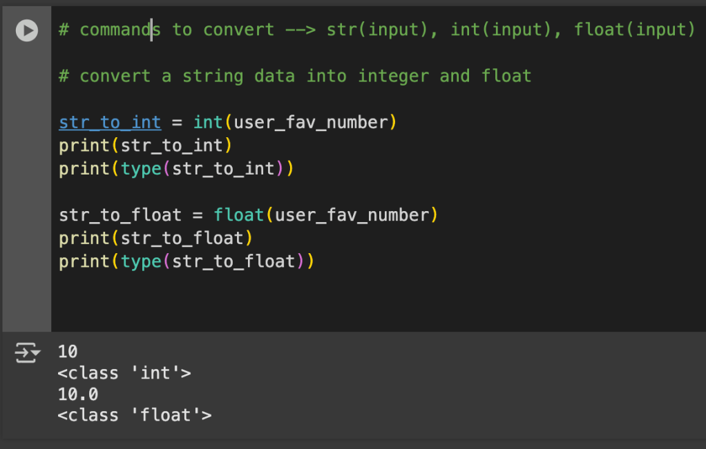 This was one of the first few (more interesting) things I was taught. It was the first time I learned how to change the type of some data. In this example we were asking the user to input their “fav_number” and were printing the number itself and its type. It fascinates me how the person who made python made it so easy to read and beginner friendly. I mean, even a complete novice can tell the language is basically english, with just a few words missing here and there. I appreciate it.