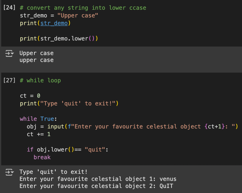The first box in the picture above shows how one can convert any string, upper or lower case, into just a lower case string. Next, I use that to create a simple input system by asking the user to input their favourite celestial objects with increasing indexes (object 1, then 2, and so on) and stop asking for their response when they input any form of the word “quit”.